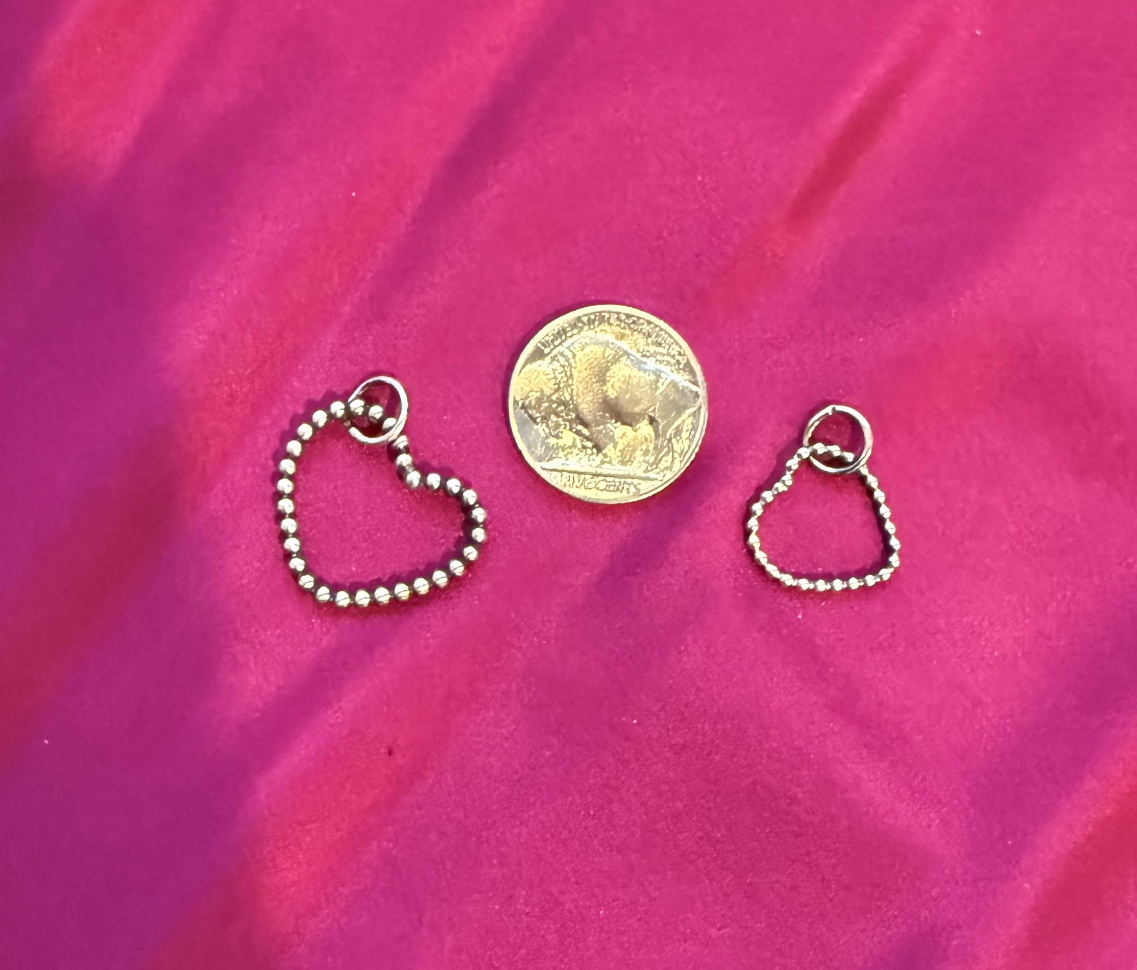 Elevate your jewelry collection with my exquisite beaded heart charms. Perfectly sized-as shown alongside a classic vintage Buffalo Nickel-these charms offer a delicate yet striking look for any occasion. Whether you’re looking to refresh your favorite necklace or find a thoughtful gift, these sterling silver pieces are a must-have.