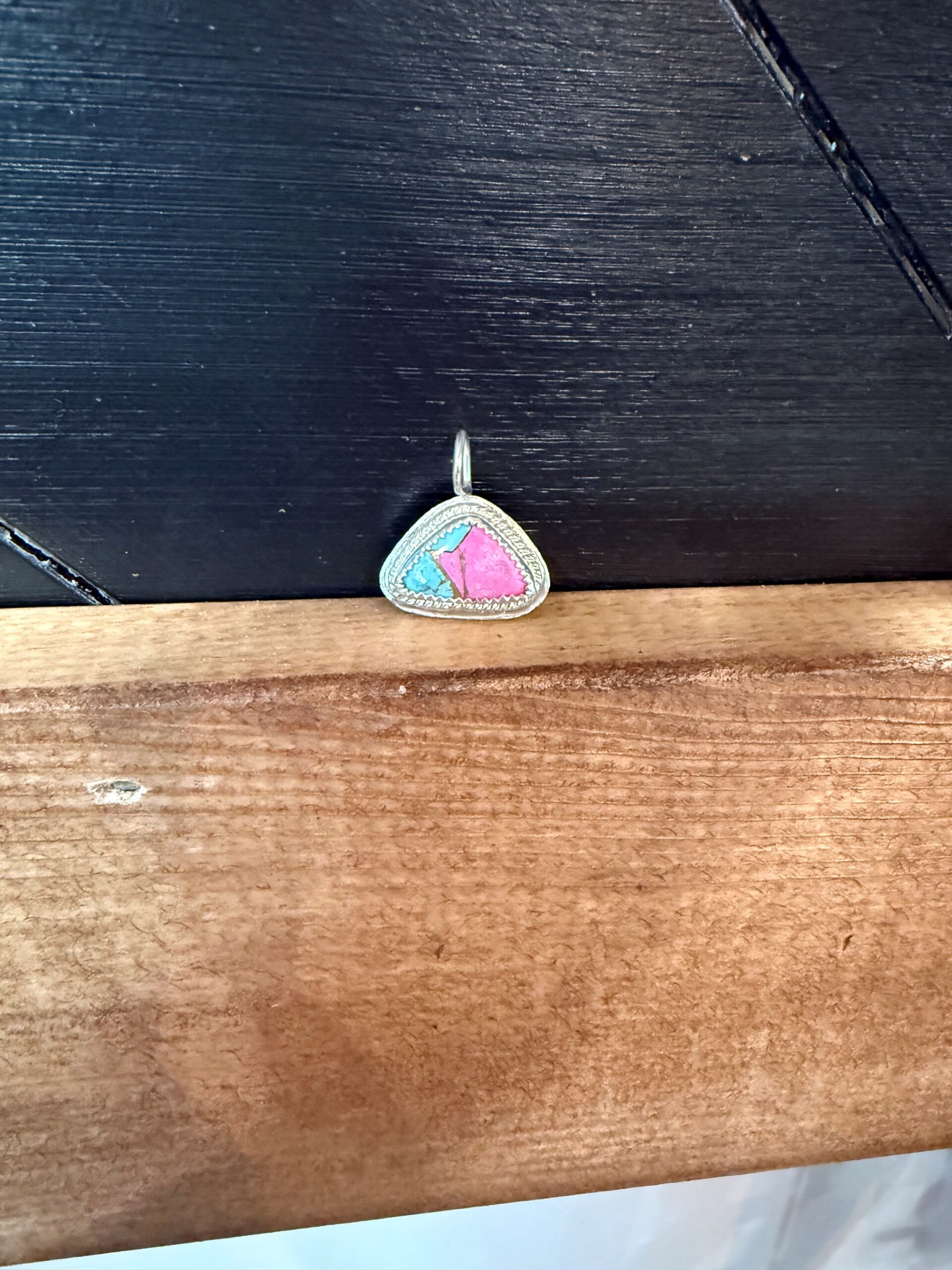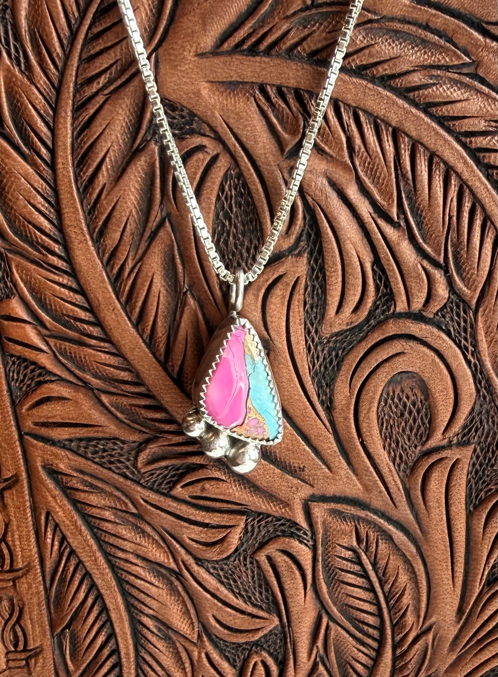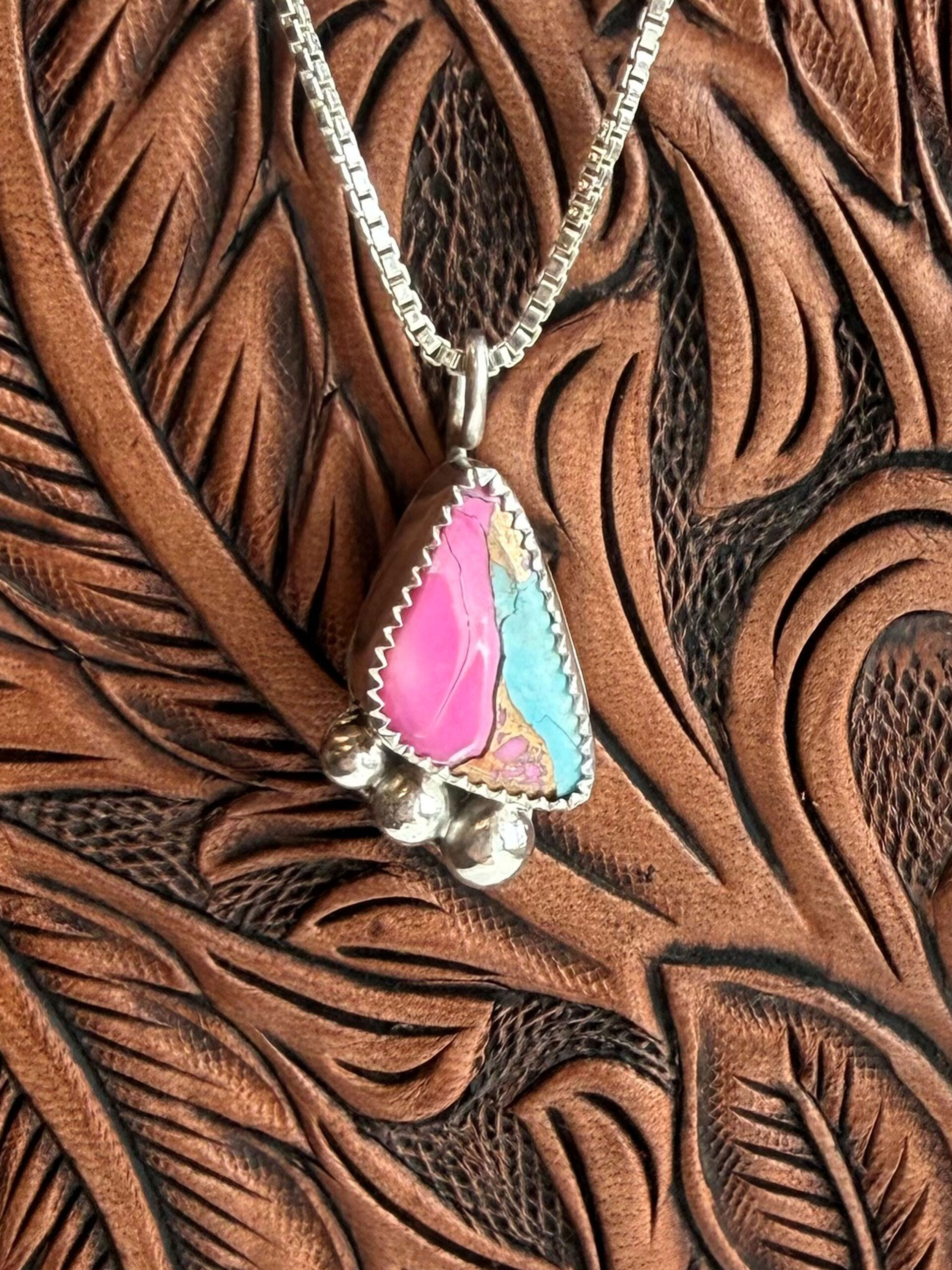 This striking handcrafted pendant features a vibrant stone displaying beautiful shades of pink and turquoise, set in sterling silver. The unique color contrast gives the piece a bold yet elegant look that captures the spirit of contemporary western jewelry design.