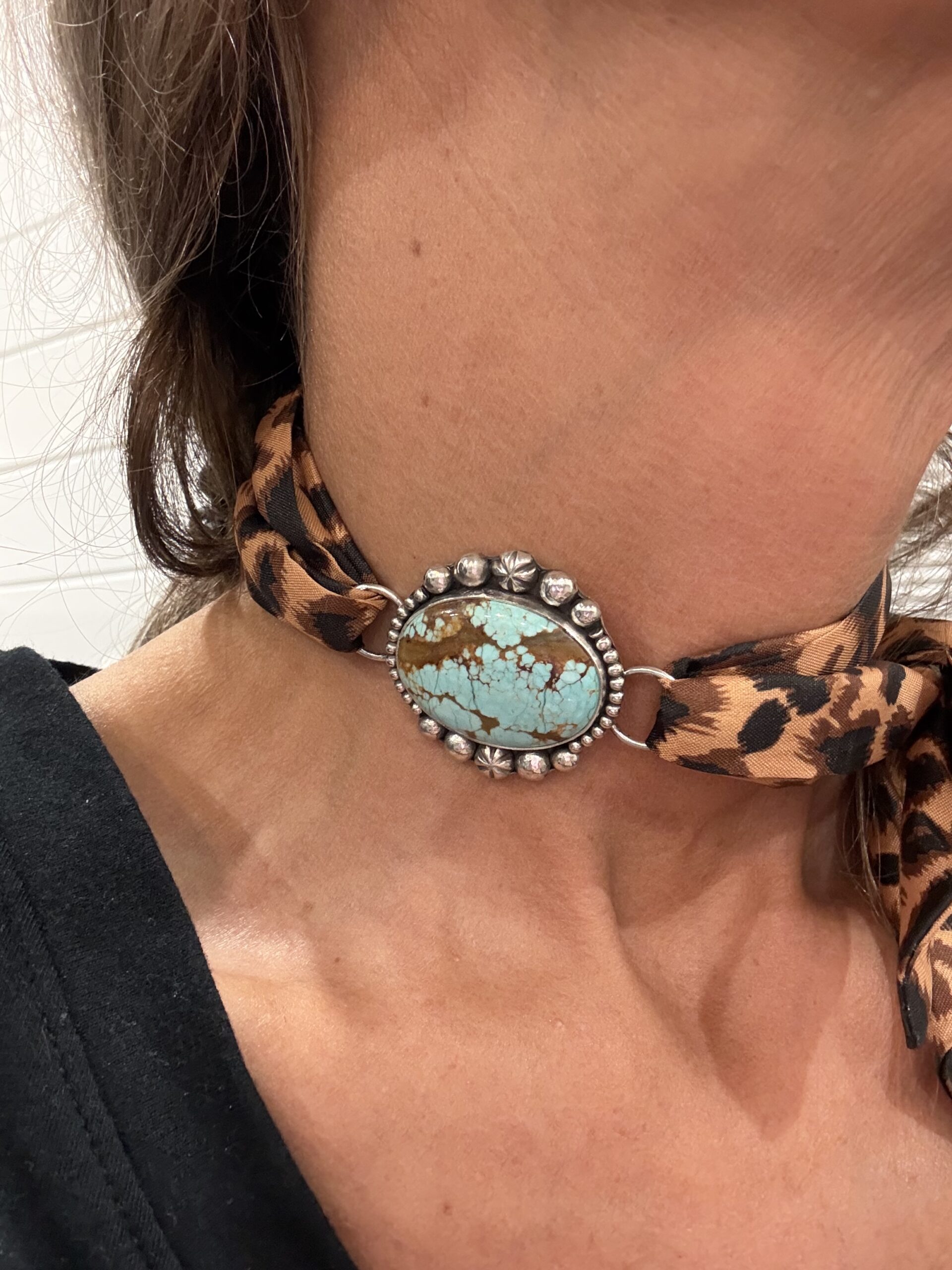 Discover the centerpiece of your accessory collection with this stunning Number 8 Mine Turquoise Twilly Scarf Slide. Featuring a legendary stone from one of Nevada’s most prestigious mines, this piece brings the timeless spirit of the Southwest to your modern wardrobe.