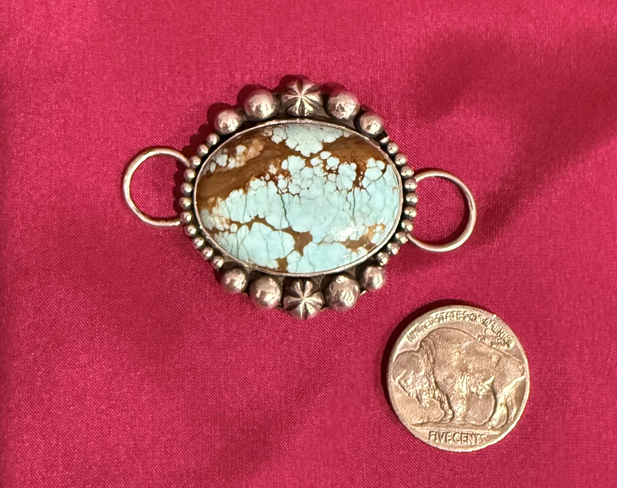 Hand-set in a decorative sterling silver bezel, accented with intricate silver beadwork and traditional sunburst embellishments.