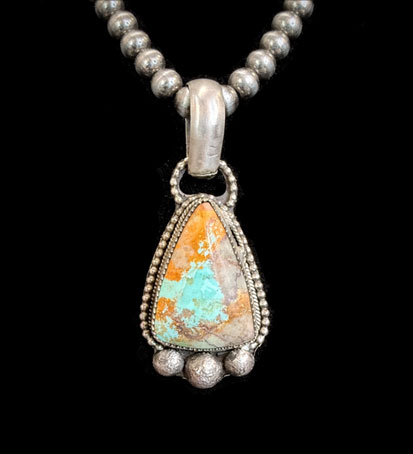 Three sterling silver accents at the base of the pendant add subtle movement and visual balance, while the handcrafted bail and Navajo-style bench bead necklace complete the design with classic southwestern character.